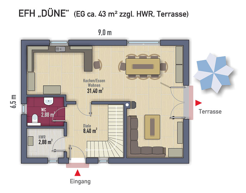 Wenn Sie es wünschen, wird auch eine hochwertige Möblierung durch uns ausgeführt. Zum Übergabetag erhalten Sie ein fertig eingerichtetes Ferienhaus. Auch später stehen wir Ihnen mit unseren Hausmeister- und Vermietungsdiensten hilfreich und kenntnisreich zur Seite.
