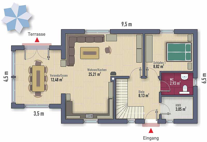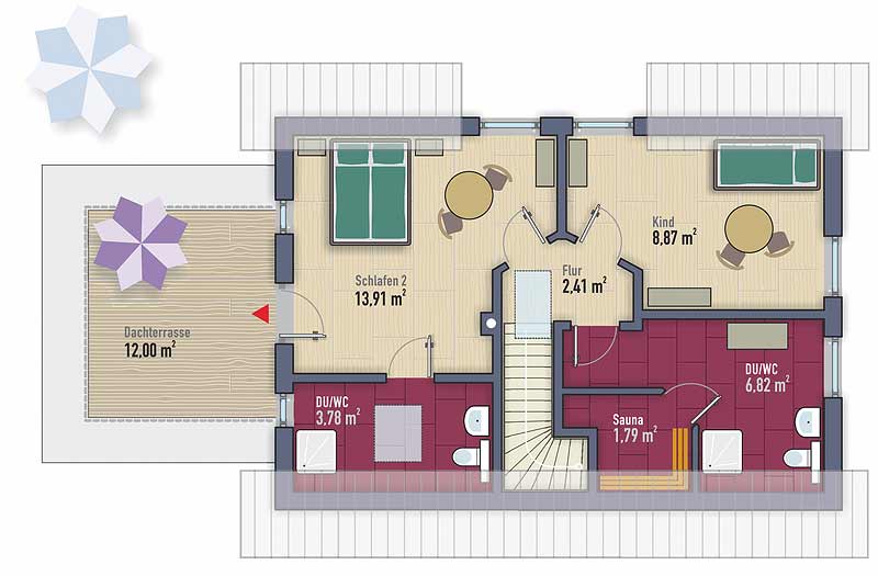 | zzgl. Flächen v. Terrasse, HWR & Dachterrasse | |