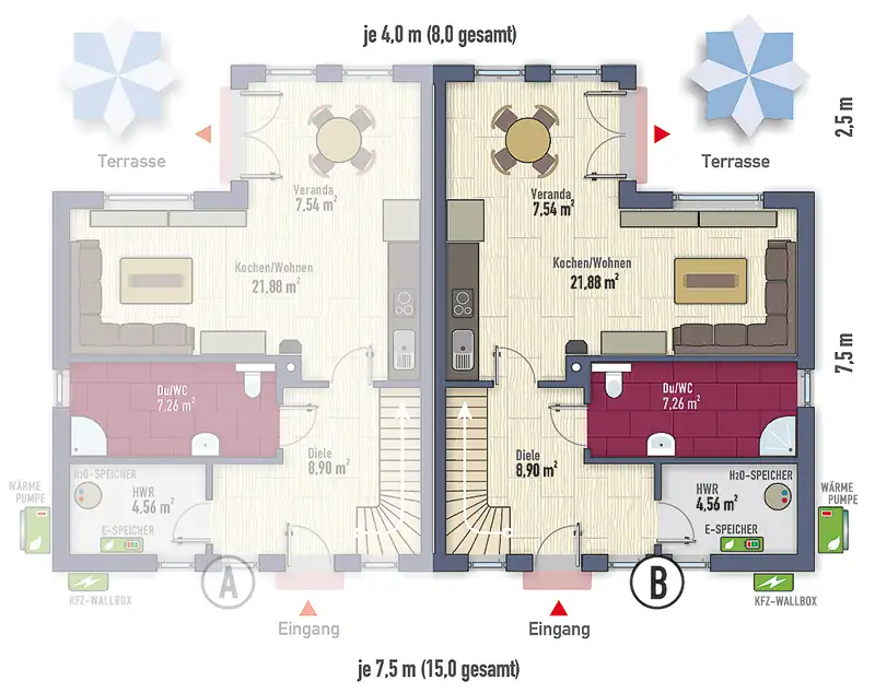 Green-Ausstattung: Für die angestrebte autarke Energiegewinnung stehen eine leistungsstarke Photovoltaik mit Luft/Wasser Wärmepumpe und großem Energiespeicher zur Verfügung. Auf eine Gastherme kann somit gänzlich verzichtet werden!