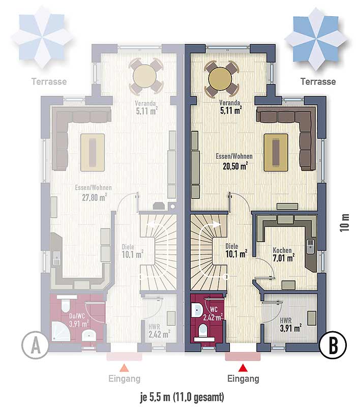 Wie alle Küstentraum-Häuser, wird auch diese 5-Sterne Doppelhaushälfte schlüsselfertig übergeben. Für uns übliche Grundstücksgrößen im Ostseebad Prerow und dem Ostseeheilbad Zingst liegen im Bereich von 250 bis 500 m². Das richtet sich ganz nach den vorhandenen Gegebenheiten. Zum fertigen Objekt gehören auch außengestalterische Landschafts- und Pflasterarbeiten sowie eine hochwertige Grundstückseinfriedung dazu.
